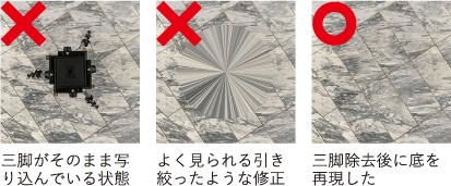 全天球写真はその特徴としてどうしても底に三脚が写り込んでしまうため、ほとんどの業者はロゴや画像をかぶせたり、周りのピクセルを巾着のように引き絞って三脚が見えないように加工しますが、当社ではクオリティを第一にまるで初めから三脚が無かったかのように一枚一枚丁寧に除去処理をしています。